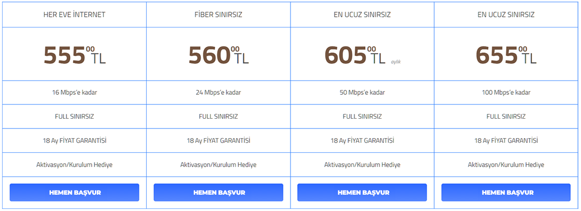Uzun yıllardır sektörde hizmet veren firmamız sizlerin kesintisiz internet kullanması için farklı hız seçeneklerini sınırsız plan çerçevesinde sunmaktadır.